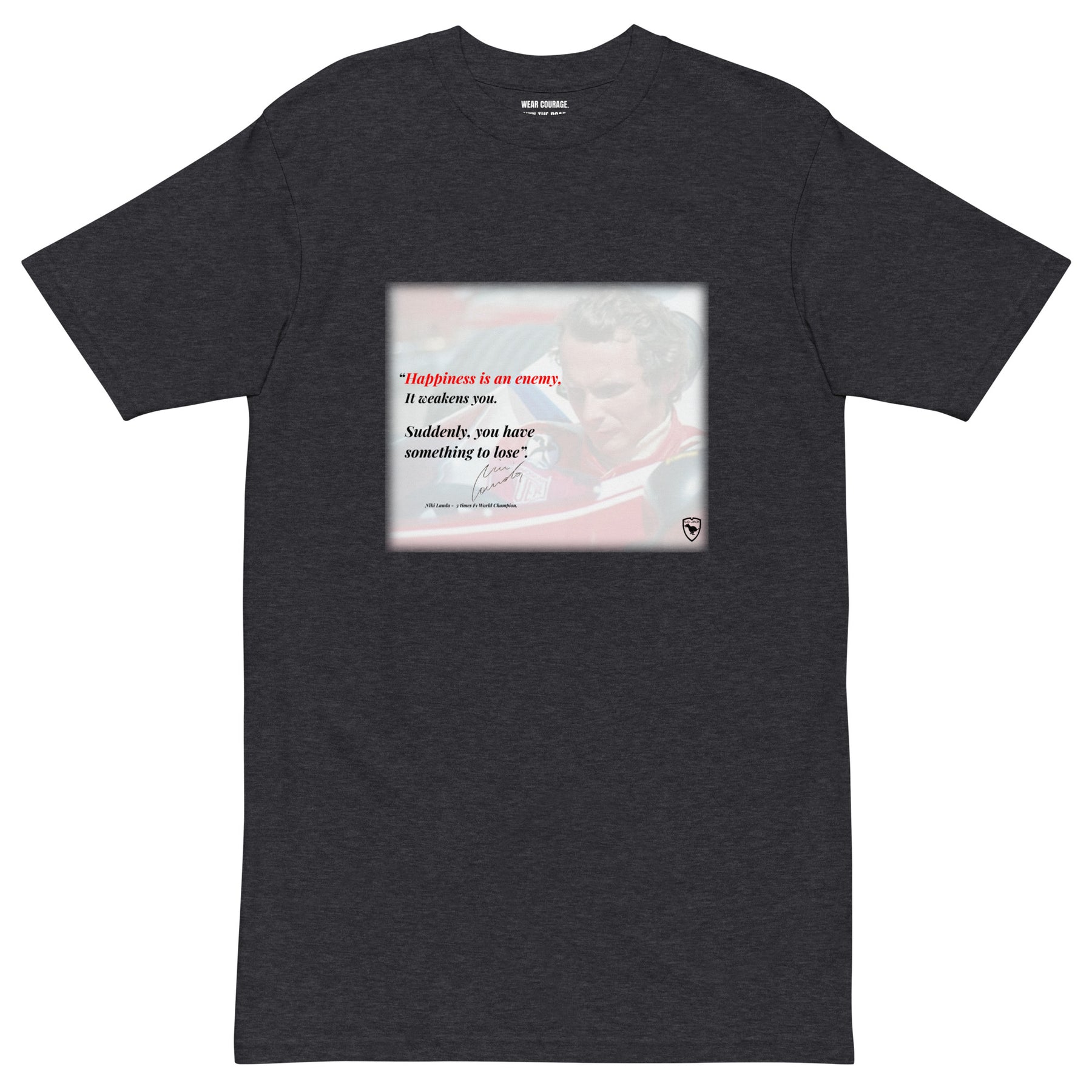 Questa t-shirt premium in cotone pesante rende omaggio a Niki Lauda, leggenda assoluta della Formula 1 e simbolo di resilienza e determinazione.